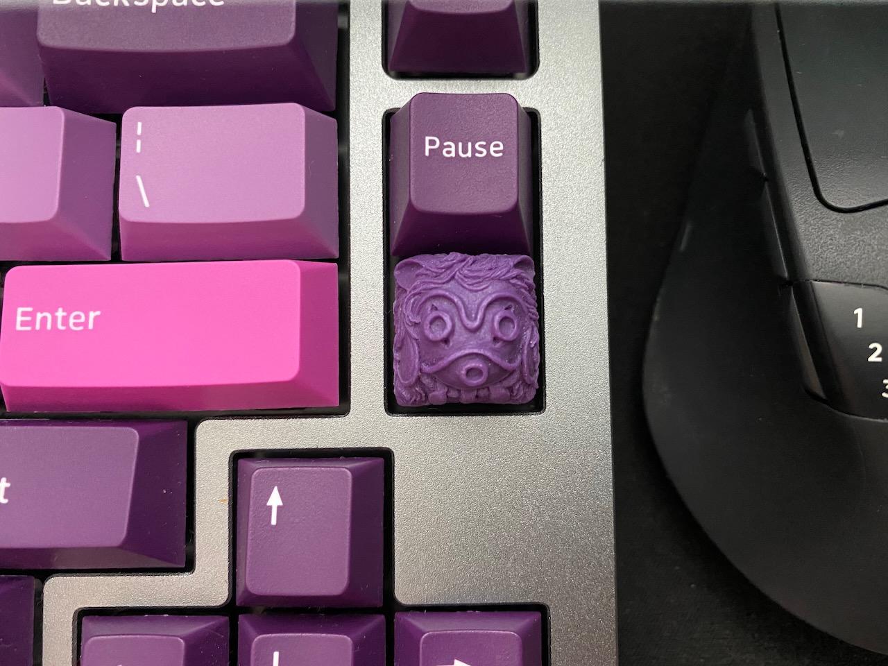 Finally, I stuck an artisan keycap (a gift from my friend and fellow keyboard enthusiast Max) in that spot—the tactile nature of the keycap means it’s really easy to find by feel to click mic muting on/off.