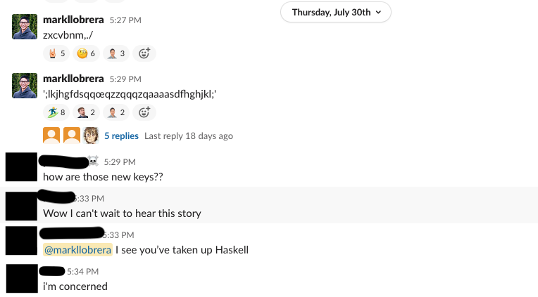 I also suggest that you not test your switches with any communications programs running; I was typing into TextMate with MacOS’s Keyboard Viewer HUD layered on top but at some point TextMate crashed and I ended up with Slack in the foreground, alarming my teammates: